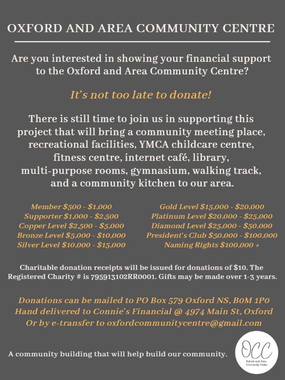 Bragg says the parade of cheques will continue until the facility opens its doors in late June, and more companies have secured naming rights for the facility’s spaces: “The ‘Oxford and Area Community Center’ name will be gone. The building will have a name which will be announced soon. The fitness center will have a name that will be announced soon. And we still have a few other rooms that we’ve got the funding arranged, but the donors are the ones that want to come and do the announcements. It’s just the timing of making these announcements.”